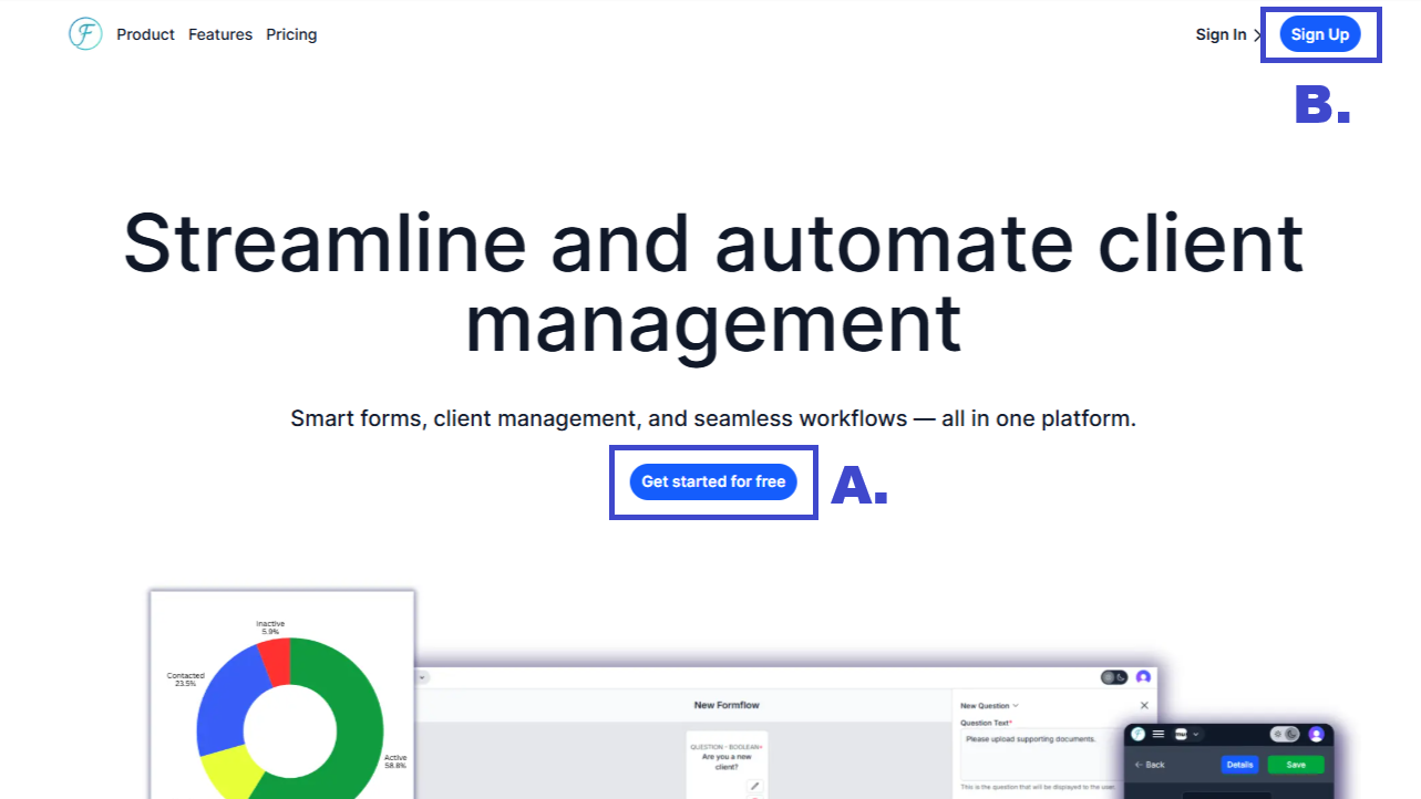On the homepage there are two buttons that can be clicked to begin the Sign up process. Both A. and B. lead to the sign up page.